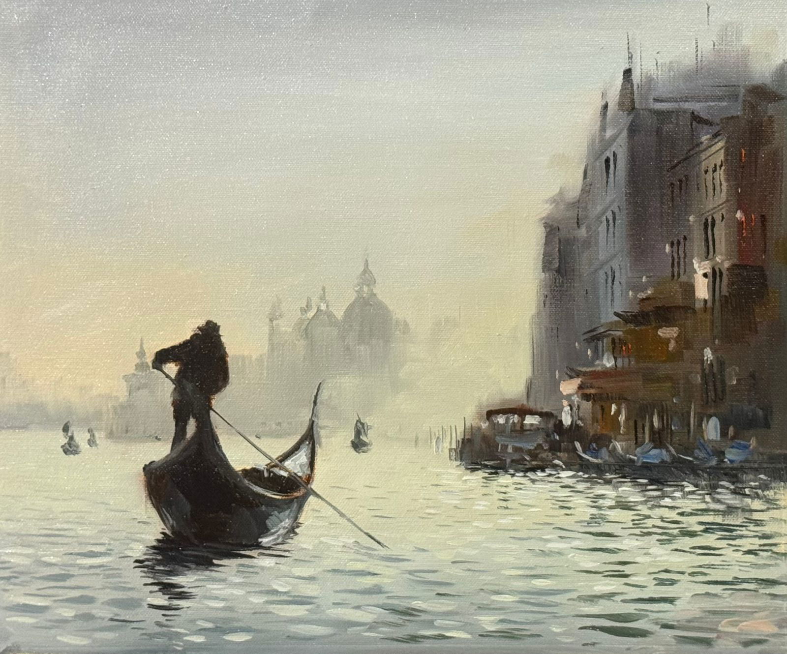 Soft light seeps through the morning mist as a lone gondolier glides across the silent waters of Venice. The distant domes fade gently into the haze, while reflections ripple beneath the oar — calm, poetic, and timeless. This painting captures that quiet moment when the city awakens in whispers, wrapped in the glow of dawn.
