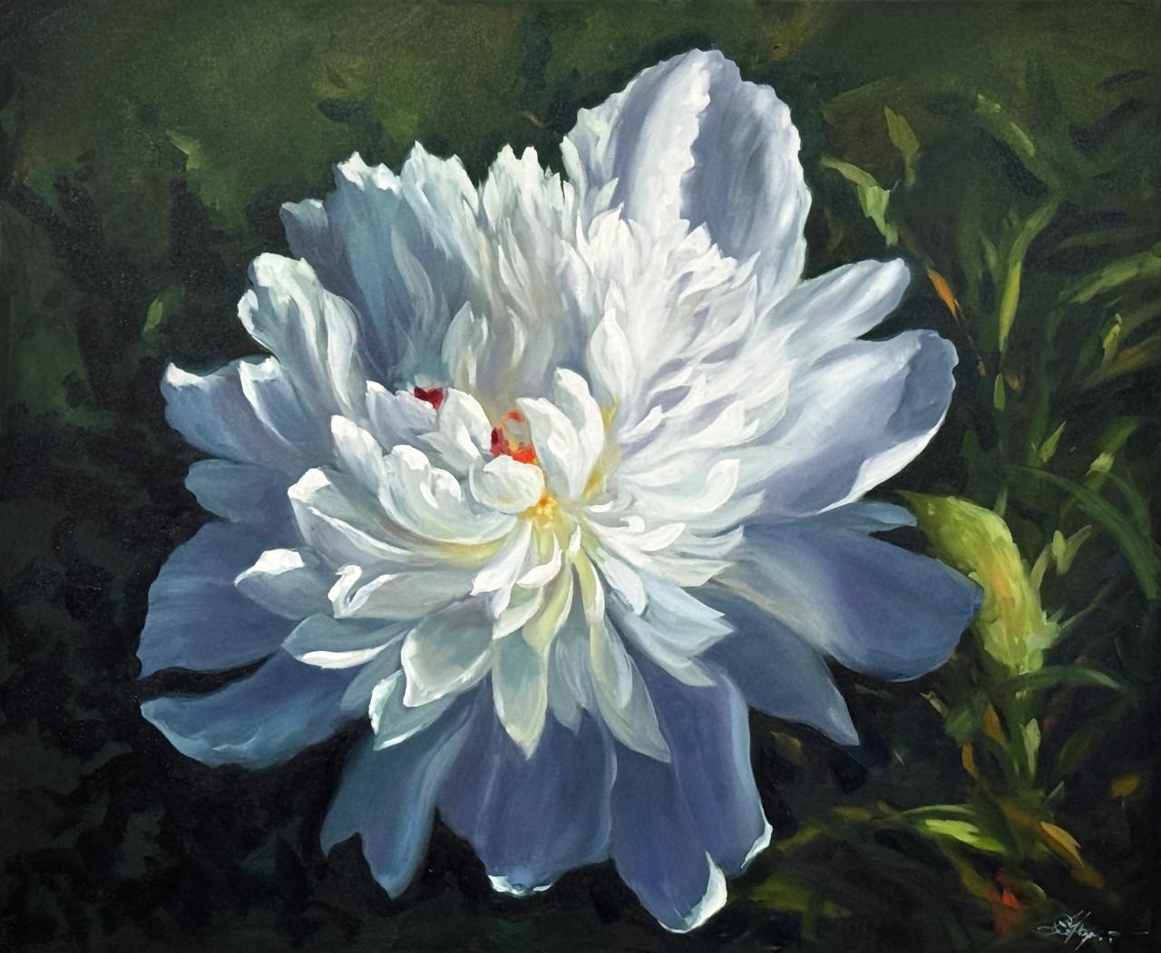 This peony is not delicate in a weak way. It is powerful in its softness. Layer after layer unfolds with confidence, holding light within its heart. I wanted to capture that quiet radiance — where white carries hints of blue, cream, and gentle warmth.