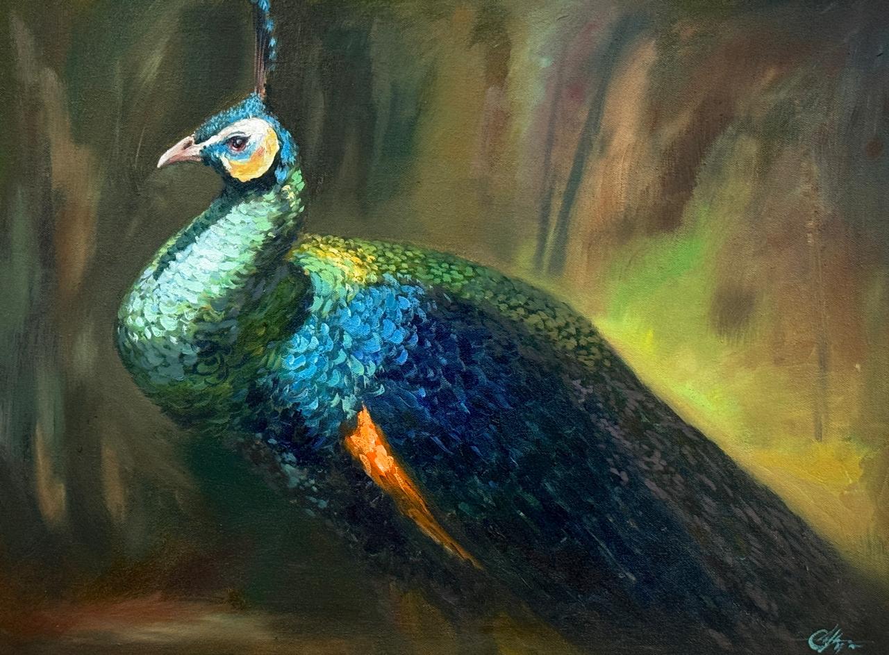 I was deeply inspired by the subtle strength of this peacock. Instead of focusing on the dramatic open feathers, I chose to capture the silent beauty — the rich blues, emerald greens, and that one glowing touch of orange reflecting light like a hidden flame.