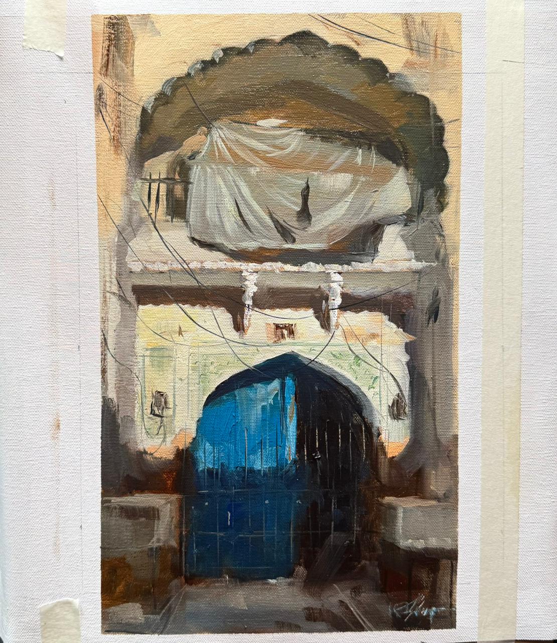An old blue gate stands quietly beneath the shade of an arched entrance, wrapped in threads of nostalgia. The play of warm ochres and cool blues reflects a dance between age and beauty. This painting captures the timeless charm of forgotten architecture, where every crack tells a story of resilience and grace.