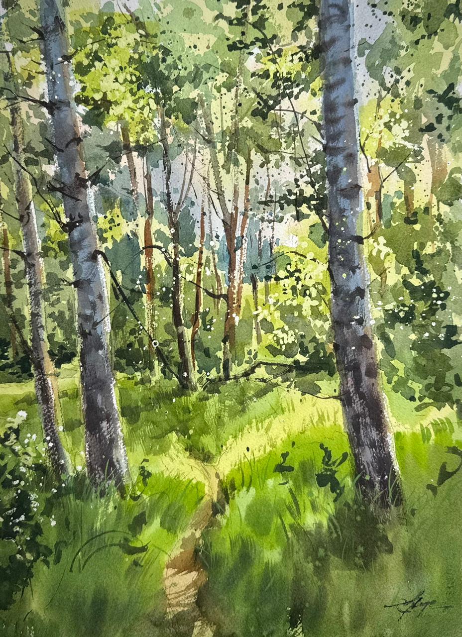 A painting is never just about trees, grass, or light. It is about how we see them. In this forest path, the play of sunlight, the rhythm of greens, and the cool quiet of shadows remind us that nature paints itself every moment. As artists, we only borrow a glimpse of that poetry and translate it into color and form.